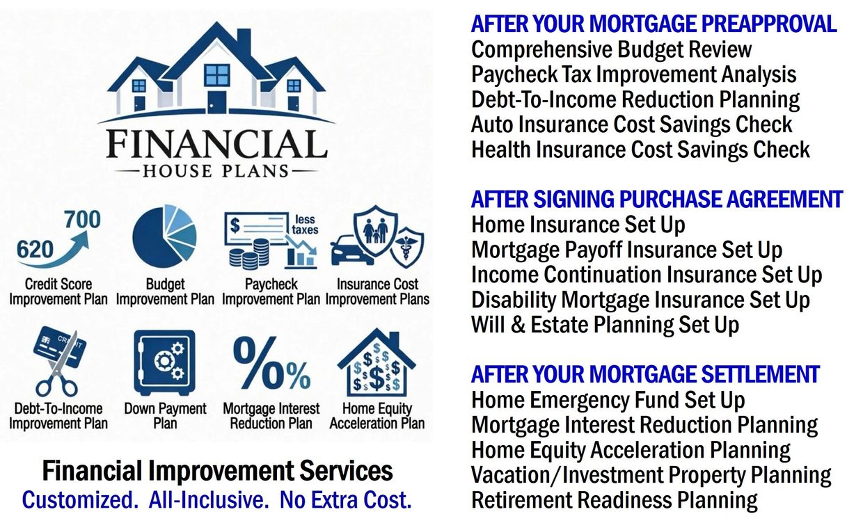 Our unique Financial House Plans process combines a detailed mortgage preapproval evaluation with a comprehensive financial analysis. This combination of services provides our clients with complete confidence while they are home hunting. More importantly, they have total financial peace of mind after settlement!